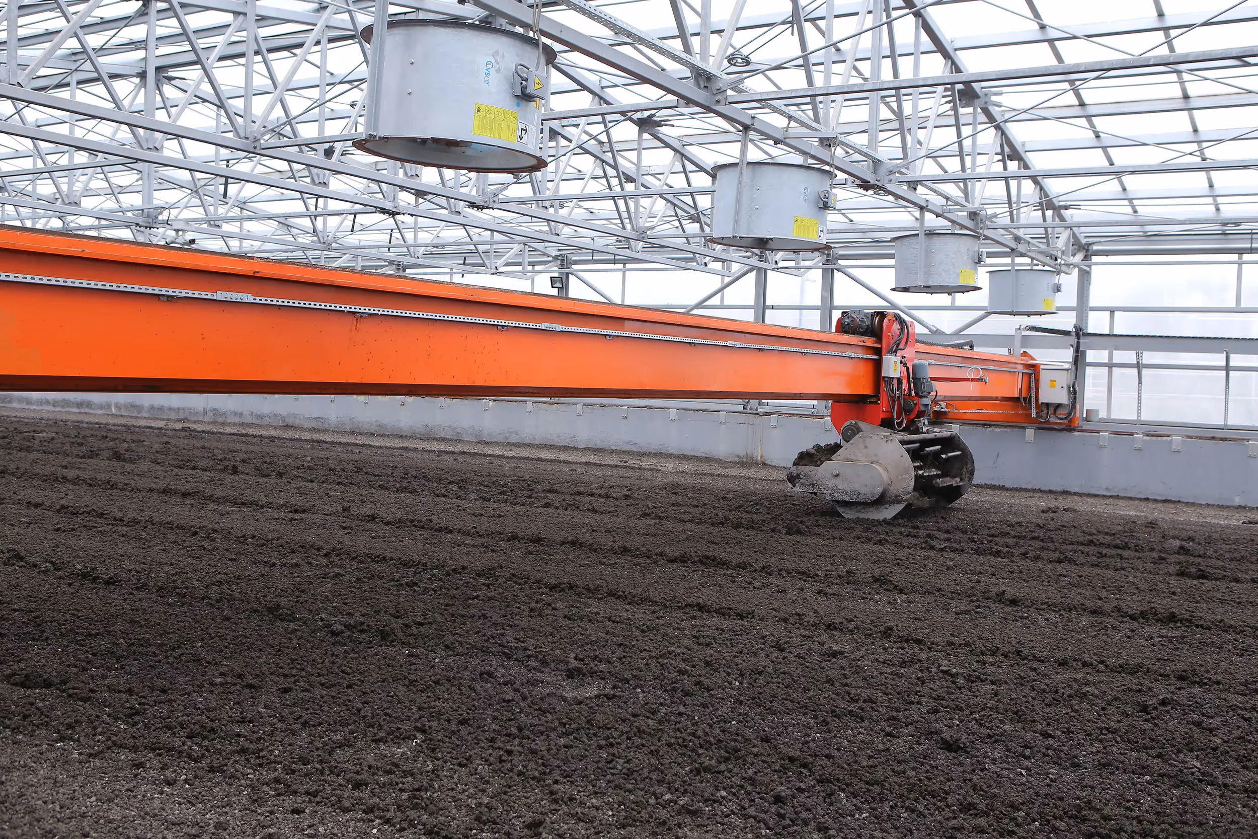 The sludge is fed into the greenhouse and than distributed over the entire surface by dedicated turning device, available in different configurations according to the specific type of sludge to be treated. Sludge height is controlled by an automated system, and once it has been omogeneously distributed, it is mixed and the air recirculation fans are activated. Completed the drying sequence, a predetermined amount of sludge is conveyed to the discharge system and extracted from the solar house.